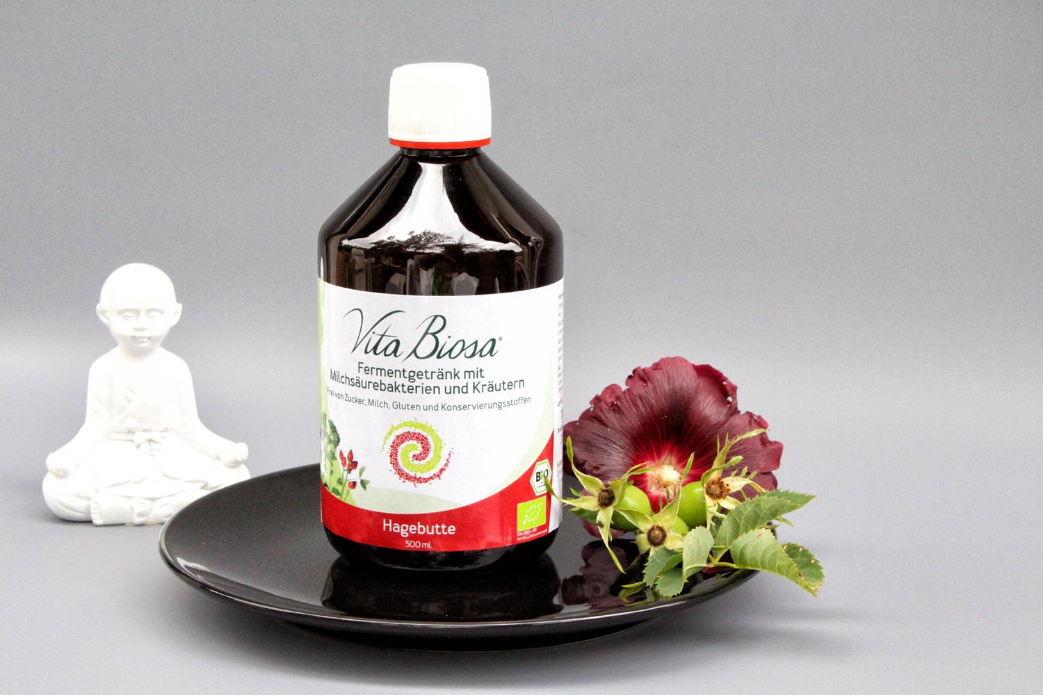 - das Bio Vita Biosa Kräuterfermentgetränk Hagebutte in der praktischen 500ml Flasche.