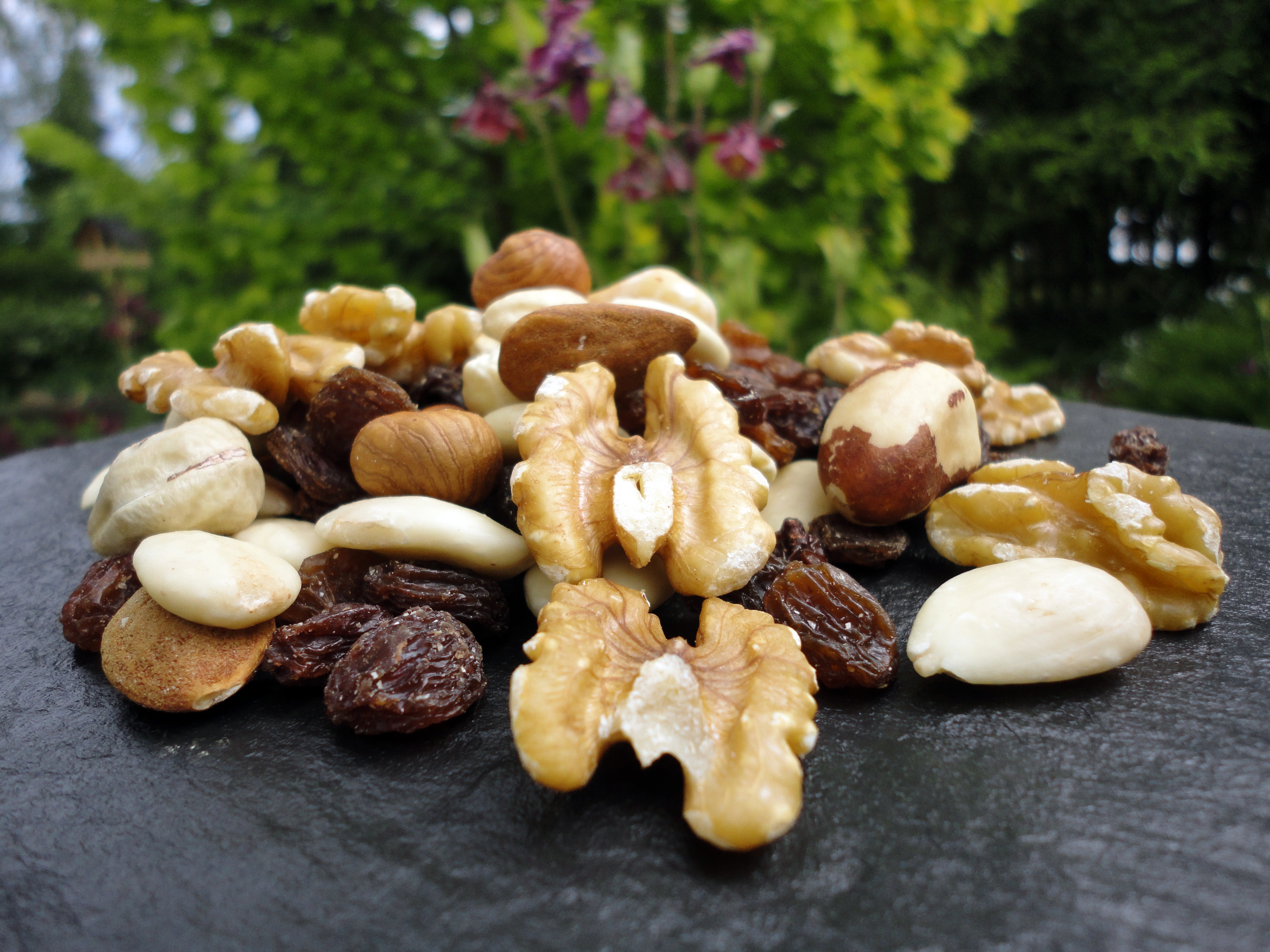 - 56% raisins* (99,5% raisins*, suflower oil*), 32% nut kernels* (12% brazil nuts*, 8% cashew nut kernels*; 8% walnut kernels*, 4% hazelnut kernels*), 12% almonds* (6% blanched*, 6% unblanched*) (*from certified organic cultivation)