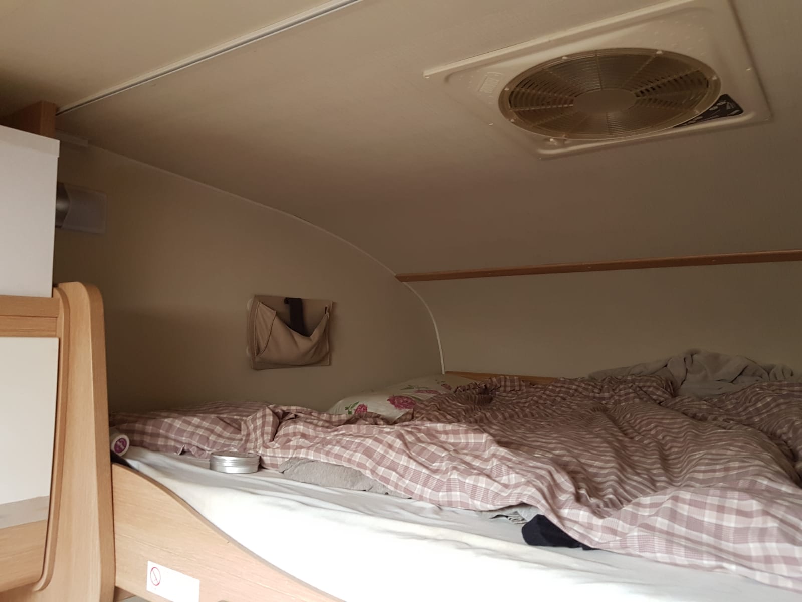 - Aufdrehbare Fenster mit Lüftern über dem Alkovenbett und über dem oberen Etagenbett